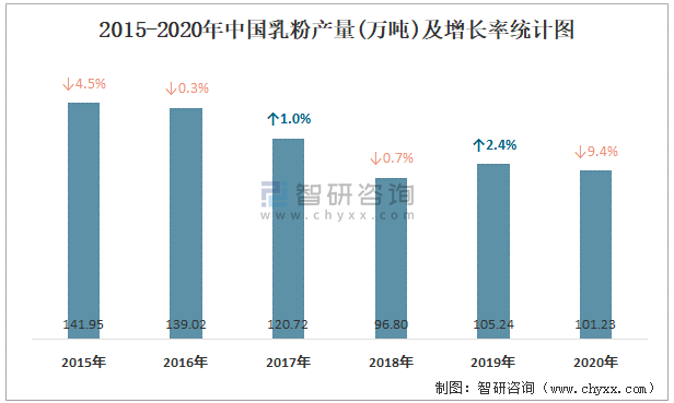 2015-2020年中國(guó)乳粉產(chǎn)量及增長(zhǎng)率統(tǒng)計(jì)圖