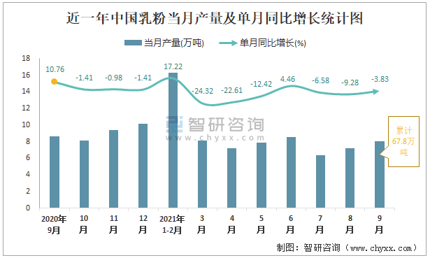 近一年中國(guó)乳粉當(dāng)月產(chǎn)量及單月同比增長(zhǎng)統(tǒng)計(jì)圖