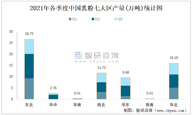 2021年各季度中國(guó)乳粉七大區(qū)產(chǎn)量統(tǒng)計(jì)圖