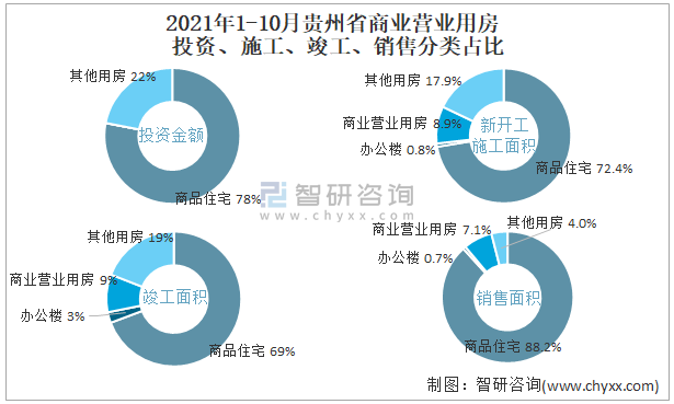 2021年1-10月貴州省商業(yè)營(yíng)業(yè)用房投資、施工、竣工、銷售分類占比