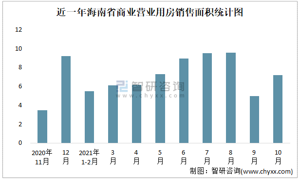 根據國家統計局數據可知:2021年9月海南省商業營業用房銷售面積為7.2萬平方米;2021年1-10月海南省商業營業用房累計銷售面積為65.25萬平方米。