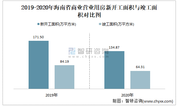 2019-2020年海南省商業營業用房新開工面積與竣工面積對比圖