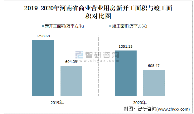 2019-2020年河南省商業(yè)營(yíng)業(yè)用房新開工面積與竣工面積對(duì)比圖
