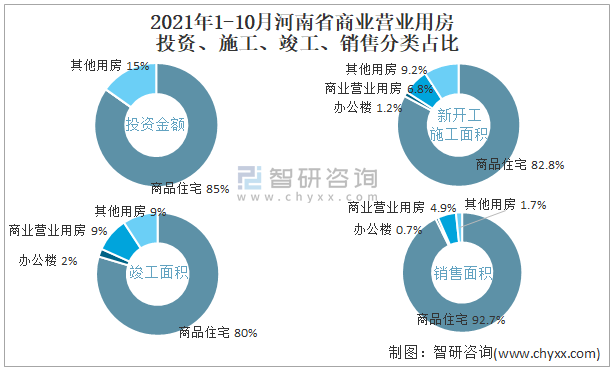 根據(jù)國(guó)家統(tǒng)計(jì)局?jǐn)?shù)據(jù)統(tǒng)計(jì)可知:2021年1-10月河南省房地產(chǎn)開發(fā)企業(yè)在包括商業(yè)營(yíng)業(yè)用房在內(nèi)的其他用房投資金額占比為15.2%(注:只有投資金額中其他用房包含辦公樓、商業(yè)營(yíng)業(yè)用房),商業(yè)營(yíng)業(yè)用房的新開工面積與竣工面積所占比重差異不大,從銷售面積來(lái)看,商業(yè)營(yíng)業(yè)用房銷售面積占比高于辦公樓銷售面積占比。