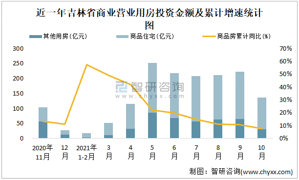 根據(jù)國家統(tǒng)計(jì)局?jǐn)?shù)據(jù)統(tǒng)計(jì)可知:2021年9月吉林省房地產(chǎn)開發(fā)投資商品房投資金額為136.9億元,其中包括辦公樓、商業(yè)營業(yè)用房等其他用房31.37億元(注:辦公樓、商業(yè)營業(yè)用房未分開統(tǒng)計(jì));2021年1-10月吉林省房地產(chǎn)開發(fā)投資包括商業(yè)營業(yè)用房在內(nèi)的其他用房累計(jì)金額為417.17億元。