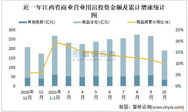 根據國家統計局數據統計可知:2021年1-10月江西省房地產開發企業在包括商業營業用房在內的其他用房投資金額占比為21.3%(注:只有投資金額中其他用房包含辦公樓、商業營業用房),商業營業用房的新開工面積與竣工面積所占比重差異不大,從銷售面積來看,商業營業用房銷售面積占比高于辦公樓銷售面積占比。