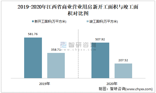 2019-2020年江西省商業營業用房新開工面積與竣工面積對比圖
