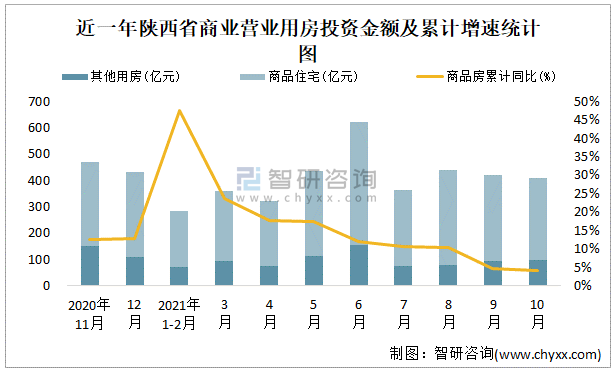 根據國家統計局數據統計可知:2021年9月陜西省房地產開發投資商品房投資金額為407.95億元,其中包括辦公樓、商業營業用房等其他用房98.91億元(注:辦公樓、商業營業用房未分開統計);2021年1-10月陜西省房地產開發投資包括商業營業用房在內的其他用房累計金額為852.07億元。