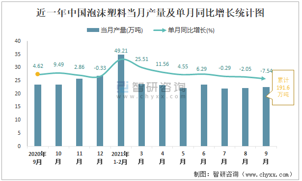 根據國家統計局數據顯示:2021年9月中國泡沫塑料產量為22.6萬噸,同比下降7.54%;2021年1-9月中國泡沫塑料累計產量為191.6萬噸,同比增長8.55%;2015-2020年中國泡沫塑料產量2018年跌至最低,次年有所回升。