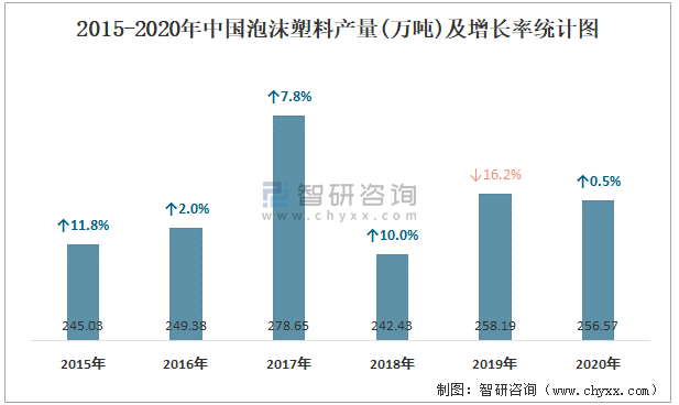 2015-2020年中國泡沫塑料產量及增長率統計圖