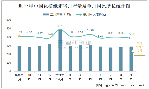 近一年中國瓦楞紙箱當月產量及單月同比增長統計圖