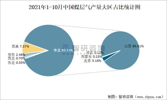 2021年1-10月中國煤層氣產量大區占比統計圖