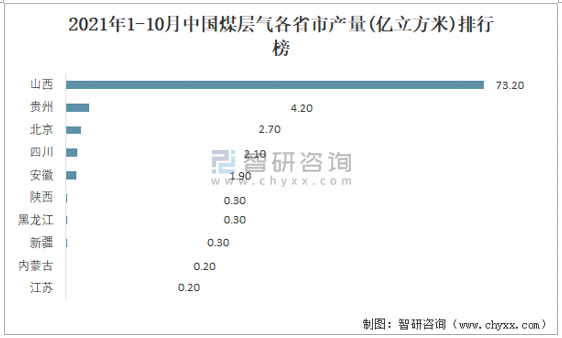 2021年1-10月中國煤層氣各省市產量排行榜