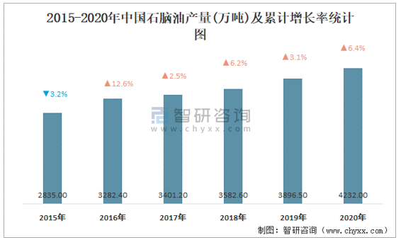 根據國家統計局數據顯示:2021年10月中國石腦油產量為453萬噸,同比增長15.2%;2021年1-10月中國石腦油累計產量為3979.7萬噸,累計增長11.3%;2015-2020年中國石腦油產量逐年遞增,2020年達到最高。
