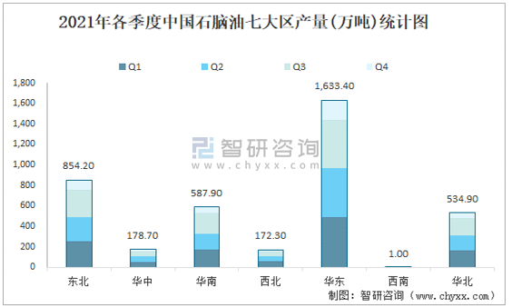 根據國家統計局數據顯示:2021年各季度(第四季度暫只統計10月數據)中國石腦油主要集中在華東、東北、華南地區生產;2021年1-10月中國石腦油產量大區分布不均衡,其中華東地區產量最高,特別是山東省貢獻了最多產量;2021年1-10月中國石腦油各省市產量呈現梯隊式分布,遼寧、山東、廣東等省產量最多。