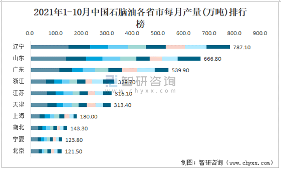 2021年1-10月中國石腦油各省市每月產量排行榜