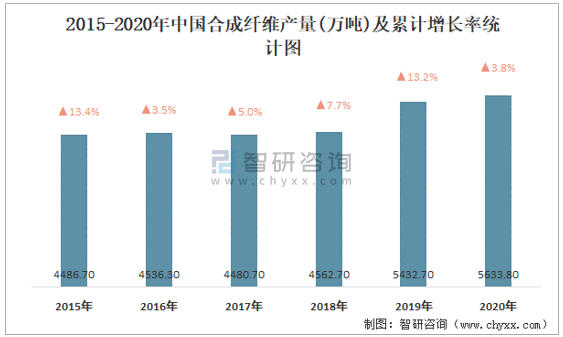 2015-2020年中國(guó)合成纖維產(chǎn)量及累計(jì)增長(zhǎng)率統(tǒng)計(jì)圖