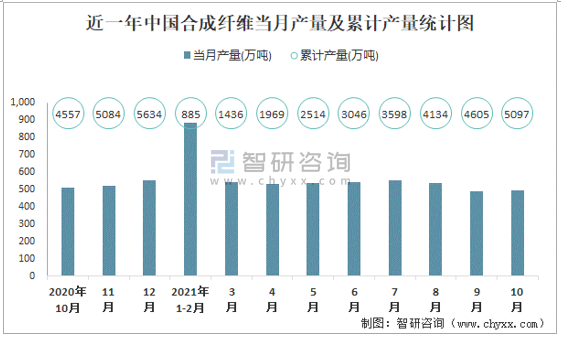 2021年1-10月中國(guó)合成纖維產(chǎn)量為5097.4萬噸 累計(jì)增長(zhǎng)11.8%
