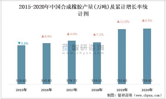 2015-2020年中國合成橡膠產(chǎn)量及累計增長率統(tǒng)計圖