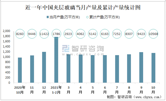 根據國家統計局數據顯示:2021年10月中國夾層玻璃產量為1156萬平方米,同比增長4.8%;2021年1-10月中國夾層玻璃累計產量為10568.1萬平方米,累計增長13.5%;2015-2020年中國夾層玻璃產量2018年跌至最低,此后逐年遞增。