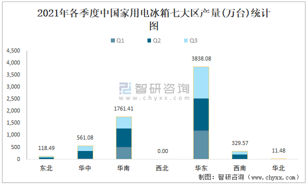 2021年各季度中國家用電冰箱七大區產量統計圖