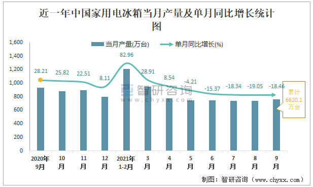 根據國家統計局數據顯示:2021年9月中國家用電冰箱產量為764萬臺,同比下降18.46%;2021年1-9月中國家用電冰箱累計產量為6620.1萬臺,同比增長2.11%;2015-2020年中國家用電冰箱產量2018年跌至最低,此后逐年遞增。