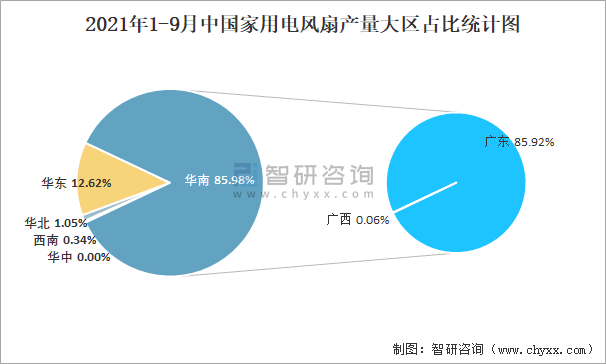 2021年1-9月中國家用電風扇產量大區占比統計圖