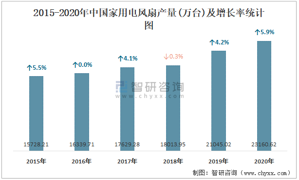 2015-2020年中國家用電風扇產量及增長率統計圖