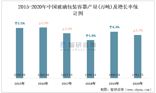 2015-2020年中國玻璃包裝容器產(chǎn)量及增長率統(tǒng)計圖