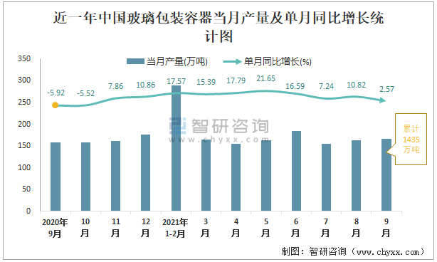 根據(jù)國家統(tǒng)計局數(shù)據(jù)顯示:2021年9月中國玻璃包裝容器產(chǎn)量為167萬噸,同比增長2.57%;2021年1-9月中國玻璃包裝容器累計產(chǎn)量為1435萬噸,同比增長12.92%;2015-2020年中國玻璃包裝容器產(chǎn)量2018年跌至最低,次年有所回升。