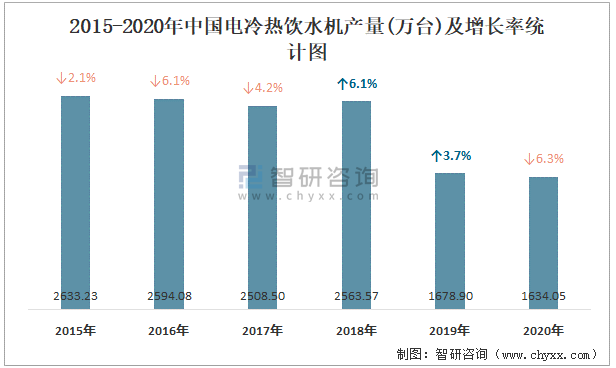 2015-2020年中國電冷熱飲水機(jī)產(chǎn)量及增長率統(tǒng)計圖