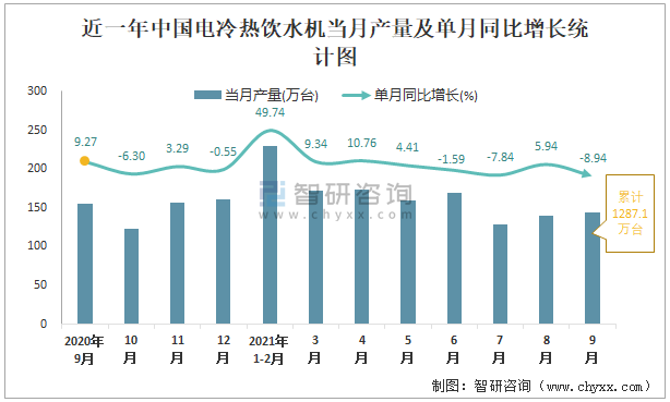 根據(jù)國家統(tǒng)計局?jǐn)?shù)據(jù)顯示:2021年9月中國電冷熱飲水機(jī)產(chǎn)量為144萬臺,同比下降8.94%;2021年1-9月中國電冷熱飲水機(jī)累計產(chǎn)量為1287.1萬臺,同比增長5.28%;2015-2020年中國電冷熱飲水機(jī)產(chǎn)量總體呈現(xiàn)下降趨勢。