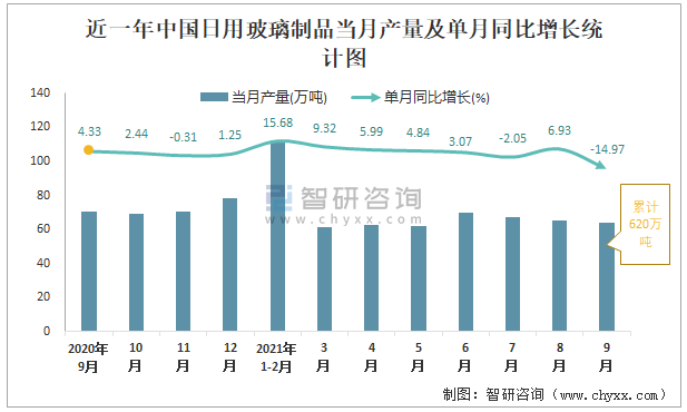 根據(jù)國家統(tǒng)計局?jǐn)?shù)據(jù)顯示:2021年9月中國日用玻璃制品產(chǎn)量為63.6萬噸,同比下降14.97%;2021年1-9月中國日用玻璃制品累計產(chǎn)量為620萬噸,同比增長11.21%;2015-2020年中國日用玻璃制品產(chǎn)量2017年達(dá)到最高,此后總體呈現(xiàn)下降趨勢。