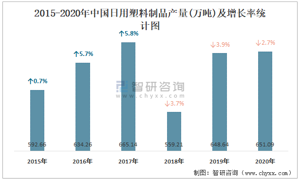 2015-2020年中國日用塑料制品產量及增長率統計圖