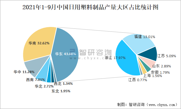 2021年1-9月中國日用塑料制品產量大區占比統計圖