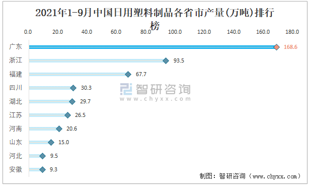 根據國家統計局數據顯示:2021年各季度中國日用塑料制品主要集中在華東、華南、華中地區生產;2021年1-9月中國日用塑料制品產量大區分布不均衡,其中華東地區產量最高,特別是浙江省貢獻了最多產量;2021年1-9月中國日用塑料制品各省產量top1遙遙領先于其他前9名,廣東。