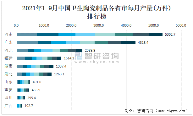 2021年1-9月中國衛生陶瓷制品各省市每月產量排行榜