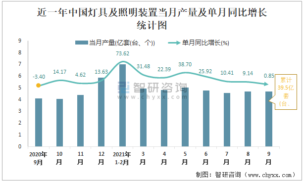 2021年1-9月中國燈具及照明裝置產量為39.5億套(臺、個) 華南地區產量最高(占比49.85%)