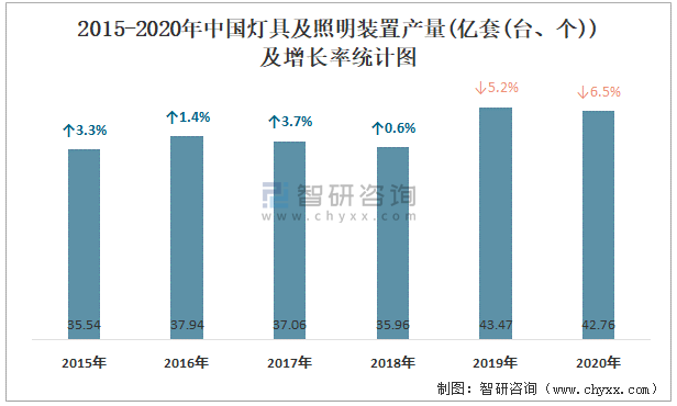 2015-2020年中國燈具及照明裝置產量及增長率統計圖