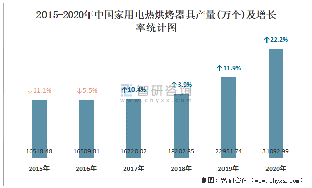 2015-2020年中國家用電熱烘烤器具產量及增長率統計圖