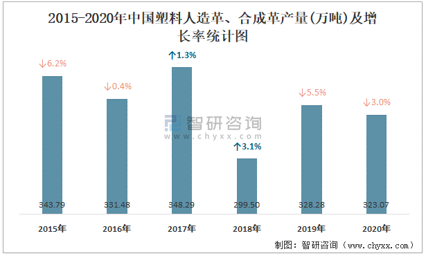 2015-2020年中國塑料人造革、合成革產量及增長率統計圖