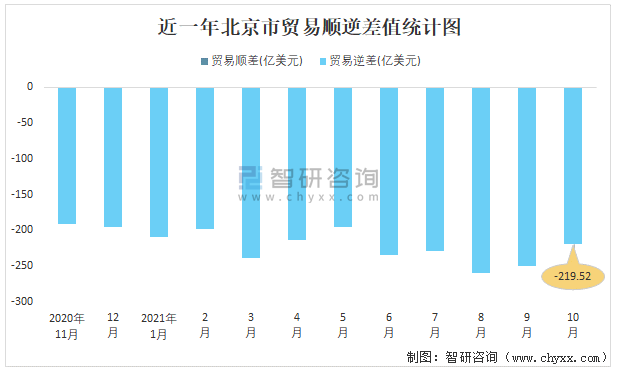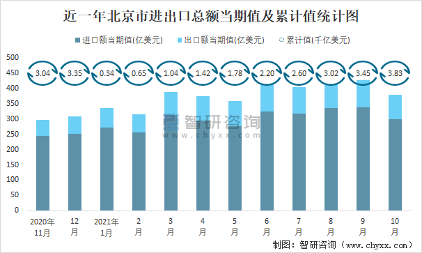 2021年10月北京市進出口總額為379.11億美元,其中進口額為299.32億美元,出口額為79.8億美元;2021年1-10月進出口總額為3.83千億美元,進出口總額(以美元計價)累計同比增長39.2%,其中累計進口額占比79.42%,累計出口額占比20.58%。2015-2020年北京市進出口總額在2019年達到最大值,次年有所下滑;2015-2020年北京市進出口貿易差值總體呈現貿易逆差狀態。