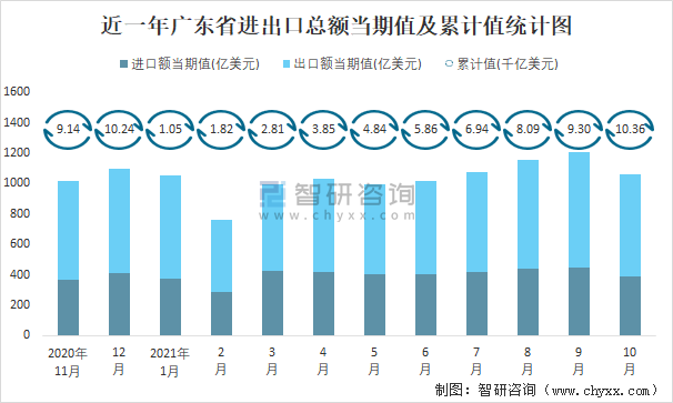 近一年廣東省進(jìn)出口總額當(dāng)期值及累計(jì)值統(tǒng)計(jì)圖
