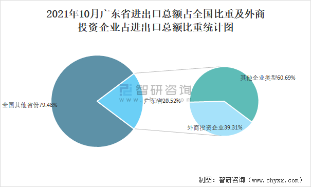 2021年10月廣東省進(jìn)出口總額占全國比重及外商投資企業(yè)占進(jìn)出口總額比重統(tǒng)計(jì)圖