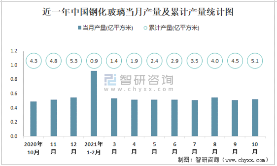 2021年1-10月中國鋼化玻璃產量為5.1億平方米 累計增長16.3%