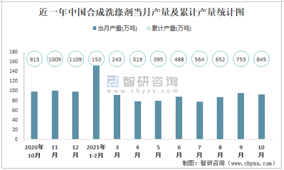 近一年中國合成洗滌劑當月產(chǎn)量及累計產(chǎn)量統(tǒng)計圖