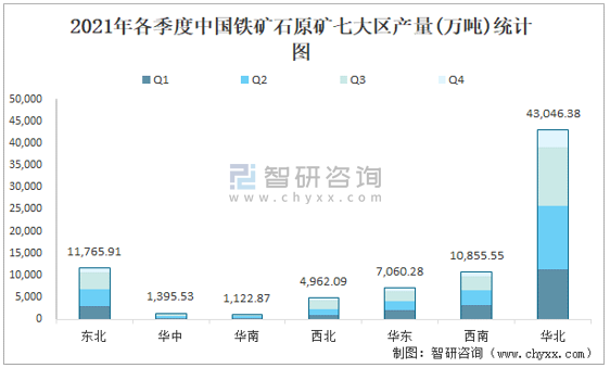 2021年各季度中國(guó)鐵礦石原礦七大區(qū)產(chǎn)量統(tǒng)計(jì)圖