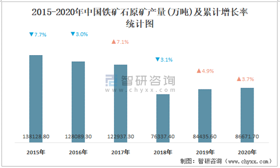 根據(jù)國(guó)家統(tǒng)計(jì)局?jǐn)?shù)據(jù)顯示:2021年10月中國(guó)鐵礦石原礦產(chǎn)量為8013萬(wàn)噸,同比下降2.8%;2021年1-10月中國(guó)鐵礦石原礦累計(jì)產(chǎn)量為82311.1萬(wàn)噸,累計(jì)增長(zhǎng)11.5%;2015-2020年中國(guó)鐵礦石原礦產(chǎn)量2018年跌至最低,此后逐年遞增。