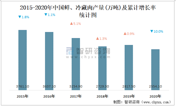 2015-2020年中國鮮、冷藏肉產量及累計增長率統計圖