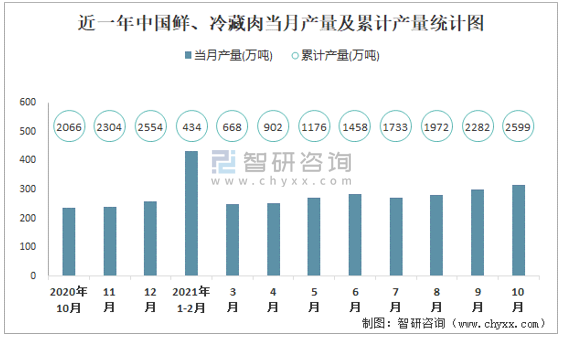 2021年1-10月中國鮮、冷藏肉產量為2599萬噸 累計增長23.6%